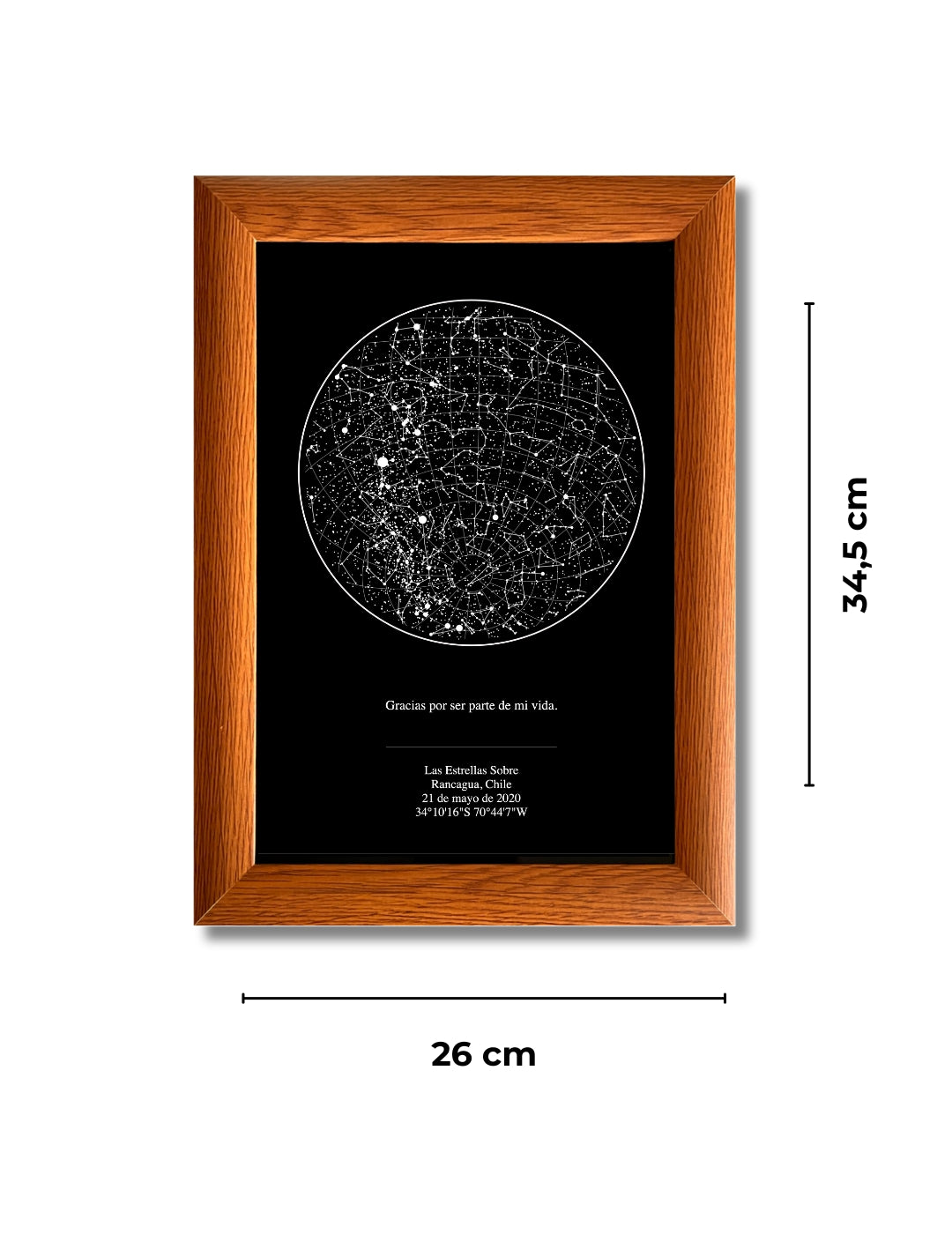 Mapa Estelar Tradicional enmarcado en negro, sobre fondo blanco, con medidas 26 x 34,5 cm indicadas junto al cuadro y diseño de cielo estrellado personalizado.